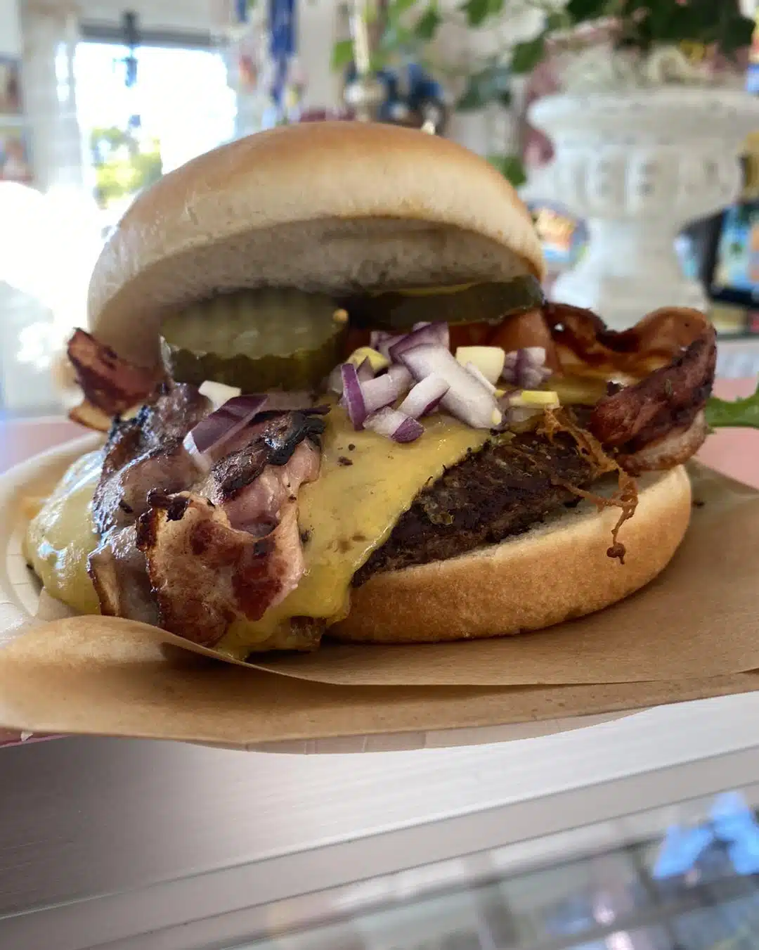 Slåtto amerikansk burger. Melk, hvete + spor av egg og sesam